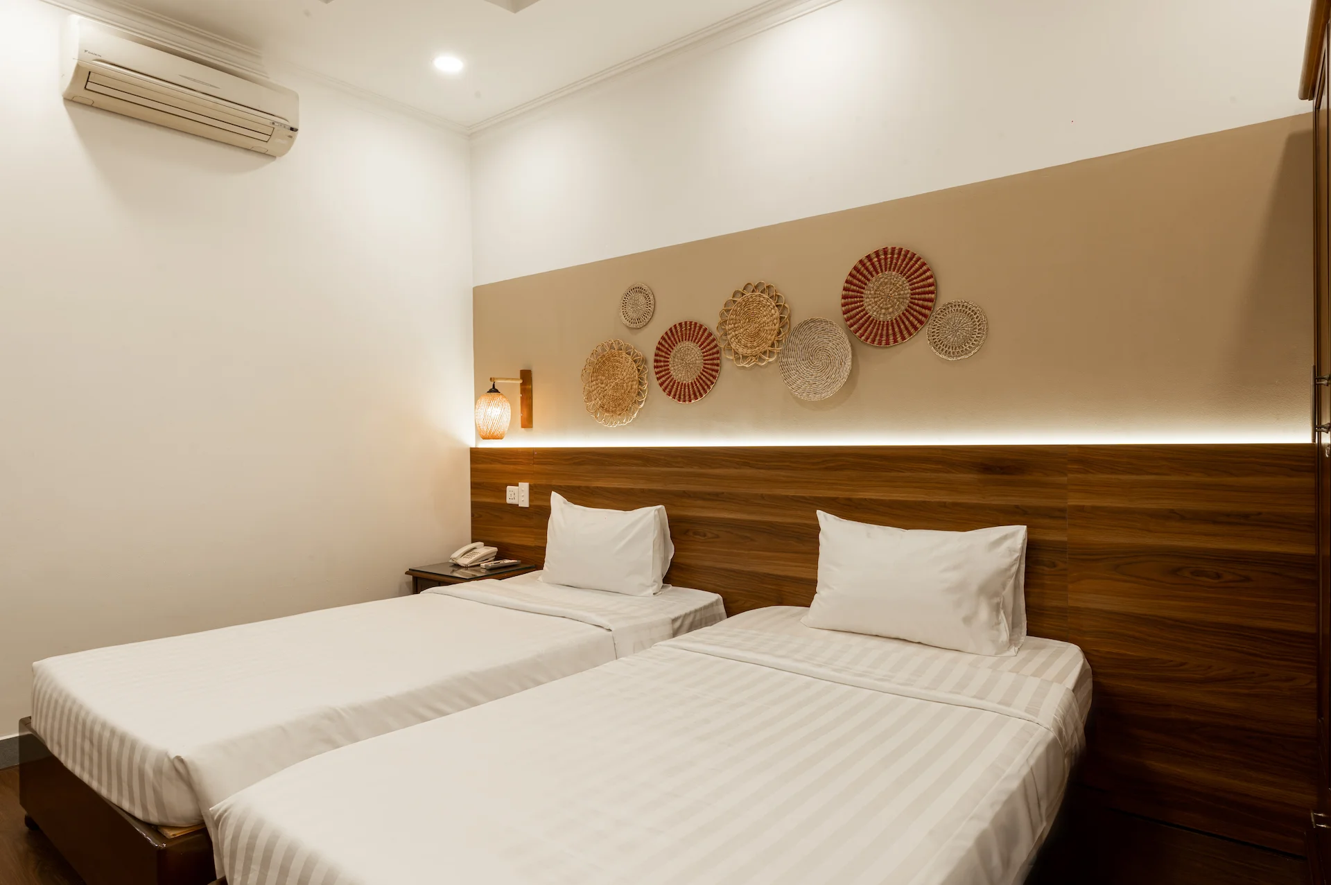 Phòng Standard Twin có cửa sổ hướng sang tòa nhà kế bên, nằm từ tầng 1 đến tầng 4. Với phòng ở tầng 4, vui lòng lưu ý: sau khi đi thang máy lên tầng 3, cần đi bộ thêm 1 tầng.